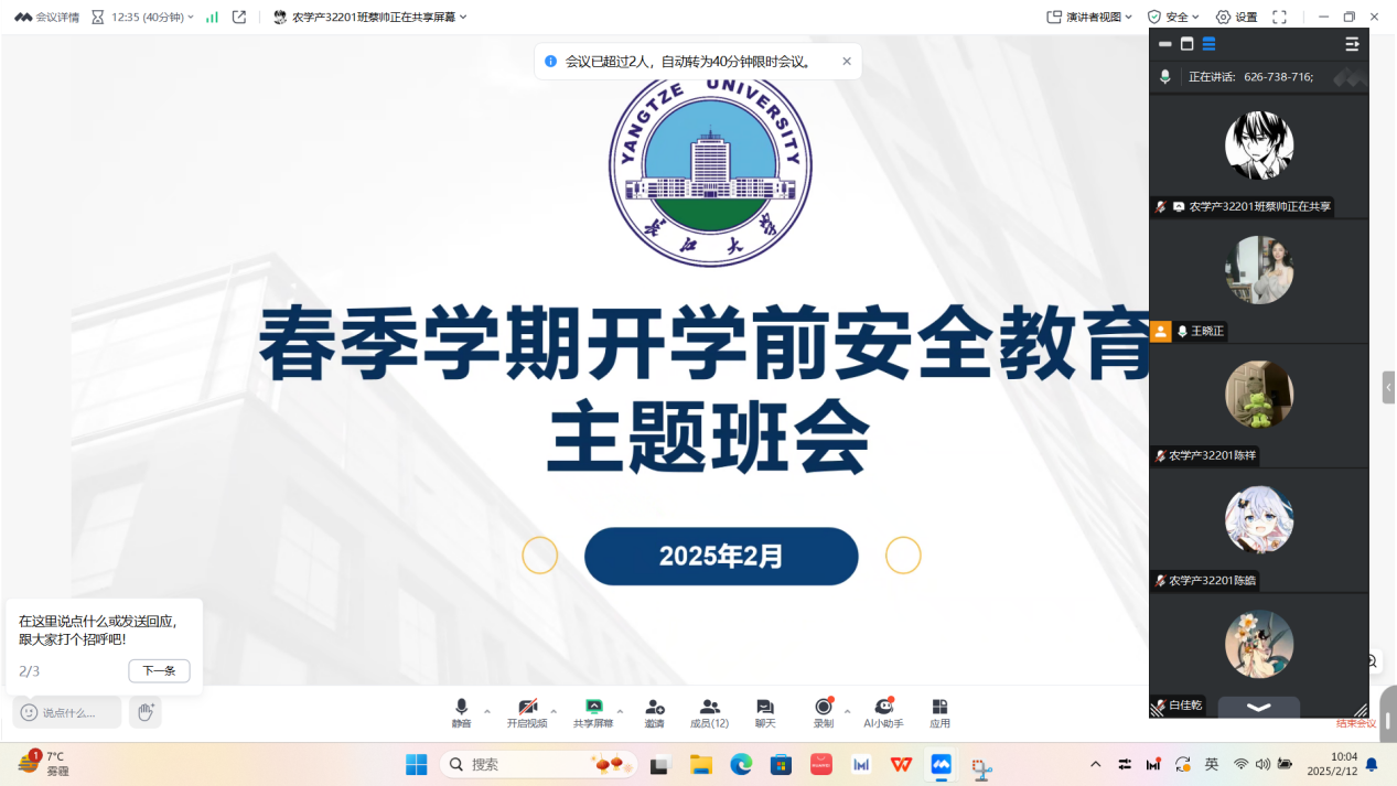 根据学校统一部署,本次安全教育班会要求班主任全程参与,确保全体学生线上参会。各班通过钉钉、腾讯会议等平台,重点传达学校春季学期返校政策,明确返校时间、报到流程等具体要求,并提醒学生提前准备相关材料,合理安排行程。针对因特殊情况暂缓返校的学生,班主任逐一联系并做好后续跟踪服务,确保安全教育全覆盖、无死角。