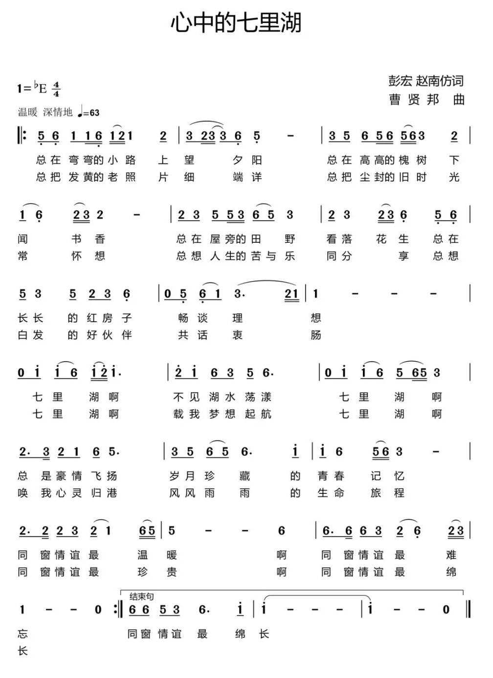 2019年5月,为筹备大学同窗40周年聚会,华中世界杯官网荆州分院土化7907班两位同学彭宏和赵南仿一同回忆七里湖校区的青春岁月,写下了诗歌《心中的七里湖》。并请著名作曲家曹贤邦先生为其配曲,曲调优美,极尽抒情。同班同学吴豫鄂拿到曲谱,等不及音乐做好,便试唱录音。现在流传开来的音频即为吴豫鄂原唱。